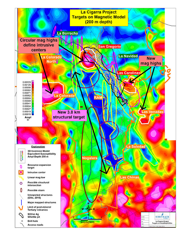 "The magnetic / radiometric program has greatly assisted Northair's technical team in identifying new targets and defining the structural framework of the La Cigarra district; a critical element in the understanding of the overall mineral system," commented, Andrea Zaradic, President & CEO of Northair. "Results from this Program have also provided important information for refining future drill programs that include targeting newly identified structural intersections that hold promise of hosting new mineral zones. These defined targets not only bolster the exploration model, but demonstrate the likely structural connection of La Cigarra to the San Francisco del Oro (Minera Frisco) and Santa Barbara (Grupo Mexico) operating mines, located approximately 20km south of La Cigarra."